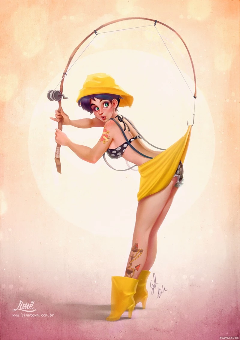 In the image, there is a stylized illustration of a girl who appears to be engaged in fishing. She is wearing a yellow raincoat and boots that resemble those made from rubber, which are suitable for
