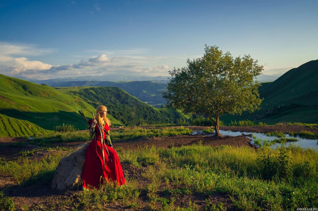 red dress and is posing near some rocks, looking out at the landscape that includes trees and rolling hills. The setting is quite picturesque, with