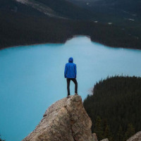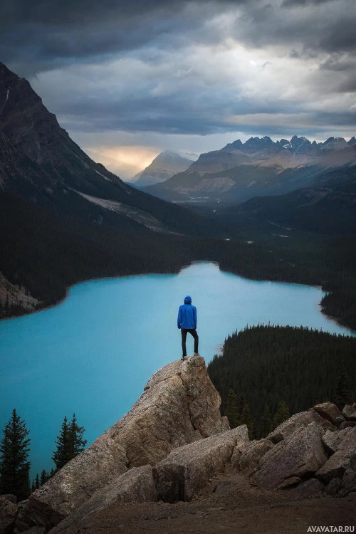 На картинке изображен человек, стоящий на скалистом обнажении с захватывающим видом на озеро бирюзового цвета, расположенное между горными хребтами. Этот природный ландшафт характерен для канадских Скалистых гор, которые известны своими потрясающими пейзажами и яркими цветами. На фотографии запечатлен момент одиночества среди величия природы.