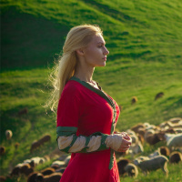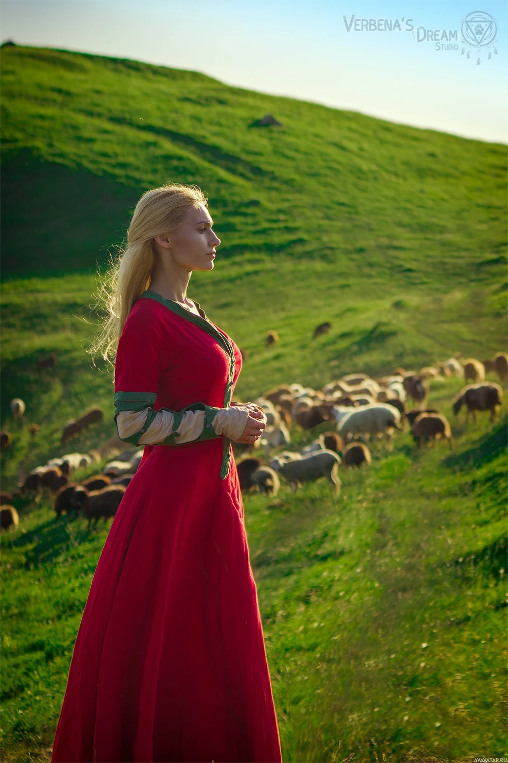 blonde hair and is wearing a red dress with a high neckline. The setting suggests a rural or pastoral environment, possibly during daytime given