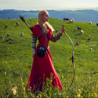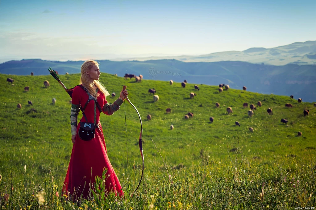 blonde hair. In her left hand, she holds a bow, and there are sheep scattered throughout the background. The overall atmosphere of the image conveys a sense of peacefulness and