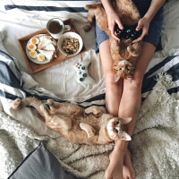 a plate of food and a bowl that looks like it could contain cat food. There is also a mug and a tray with what seems to be a drink and some other items on it. The scene captures