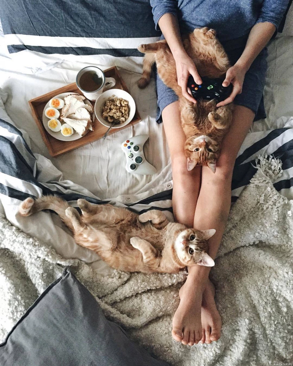 a moment of leisure and relaxation, both for the person playing the game and the cats enjoying their time around them.