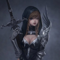 a female character. She is depicted in an artistic and stylized manner, wearing a dark fantasy-style costume that includes armor pieces and