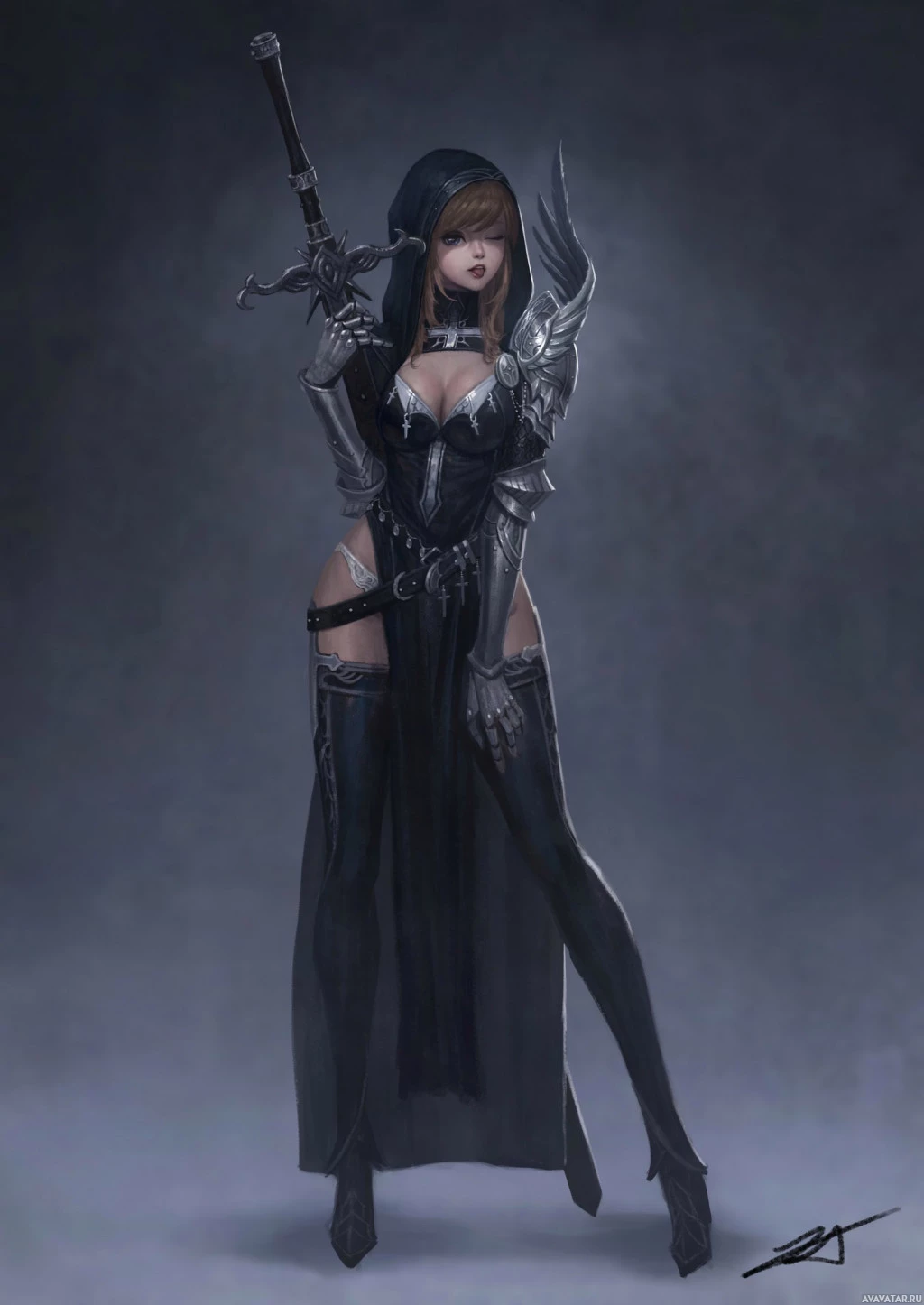 a hooded cloak. Her right hand is holding what appears to be a sword with intricate detailing. The overall tone of the image is dramatic, with the character standing against