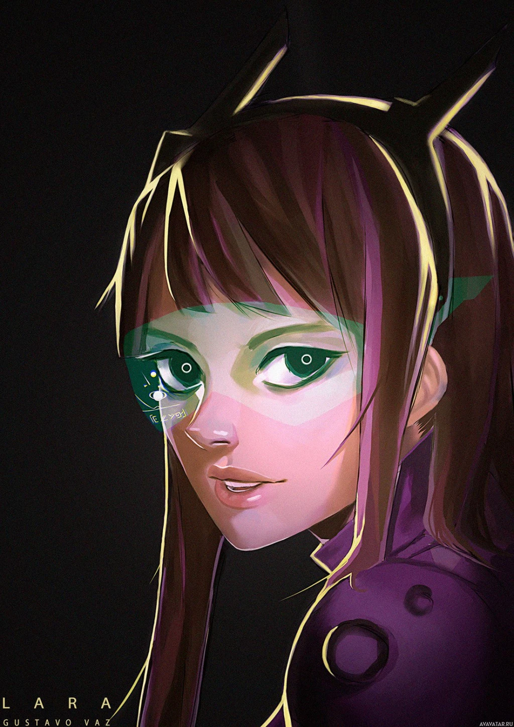 purple hair, dark eyes, and is wearing some sort of futuristic or cyberpunk-inspired armor or gear on her left side that resembles a piece of machinery or technology. Her expression is somewhat contemplative with