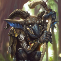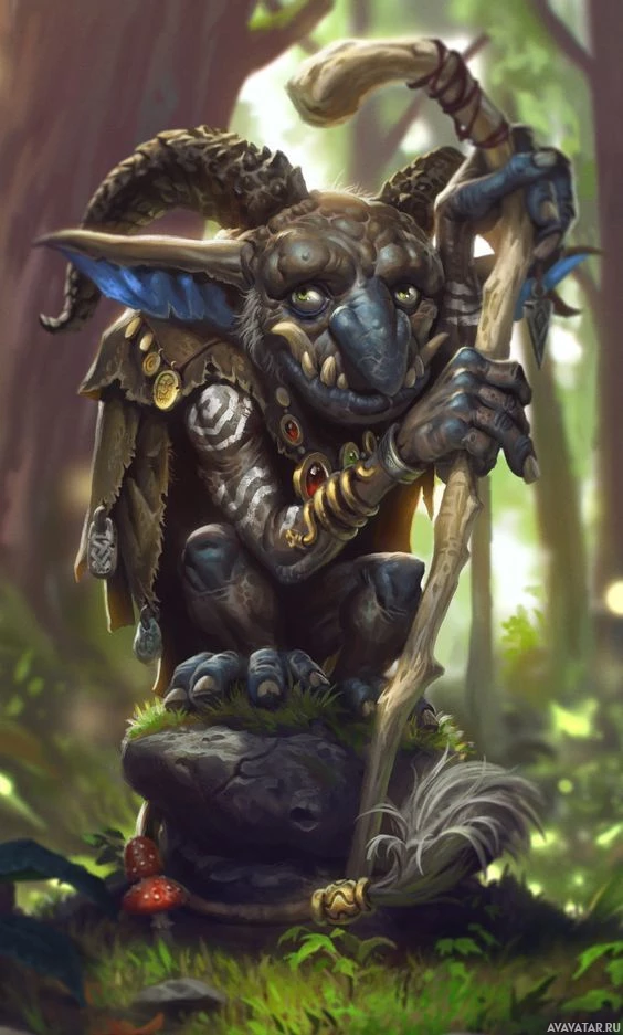 a fantasy creature that resembles a goblin. It is sitting on the ground, holding a staff or walking stick in one hand and appears to be using it to scratch its head with the other hand. The creature has pointed ears,