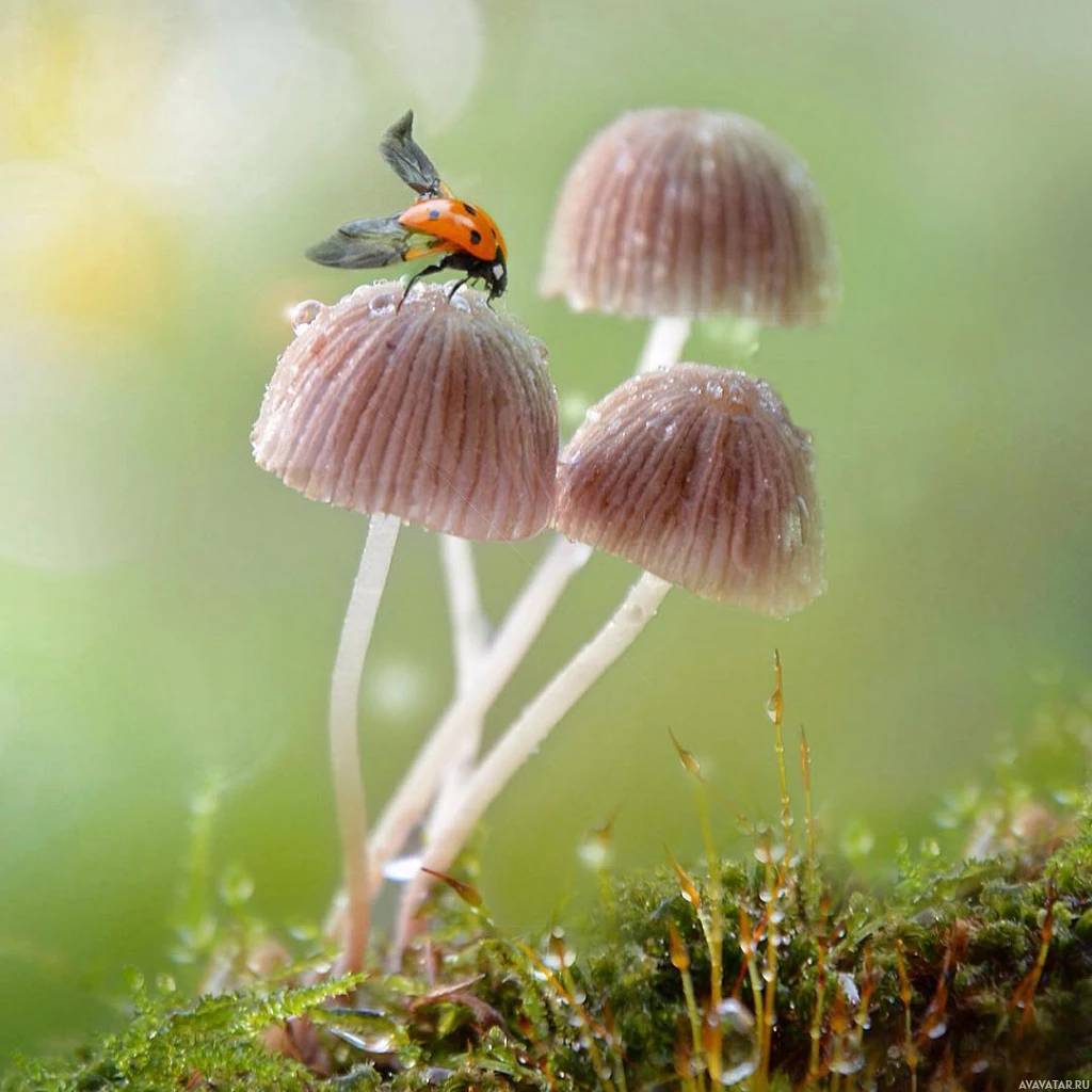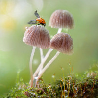 droplets of water on them, suggesting that it might have rained recently or the air is humid. Atop one of the mushrooms is a ladybug (a type of beetle), which appears to be flying away from the viewer. The focus and composition create an image that feels peaceful and natural.
