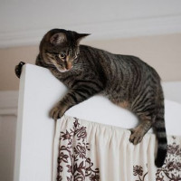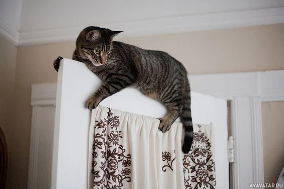 The image shows a cat standing on the edge of what appears to be a bed or crib. The cat is leaning over the side, with one paw extended onto the floor, giving an impression that it might fall off. There are some curtains visible in the background, suggesting this scene may take place indoors, possibly in