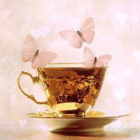 a cup of tea with honey, which is known to attract butterflies. There are two pink butterflies floating around the cup, and in the background, there are blurred hearts of