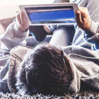 The image shows a person lying down on the floor with their head resting on a surface, such as a couch or bed. They are using a tablet device, likely for