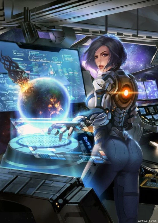 a view of a planet through the ship's window, suggesting she might be in a command or control room aboard a spacecraft.