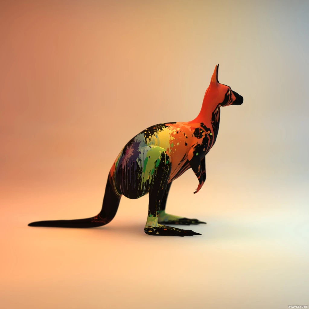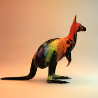 The image features a three-dimensional representation of a kangaroo. This artistic rendering is characterized by a vibrant,