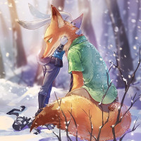 winter scene with snow-covered ground and trees. This image is reminiscent of the style found in animated films such as "Zootopia," where animals are portrayed with human characteristics and engage in human-like activities.