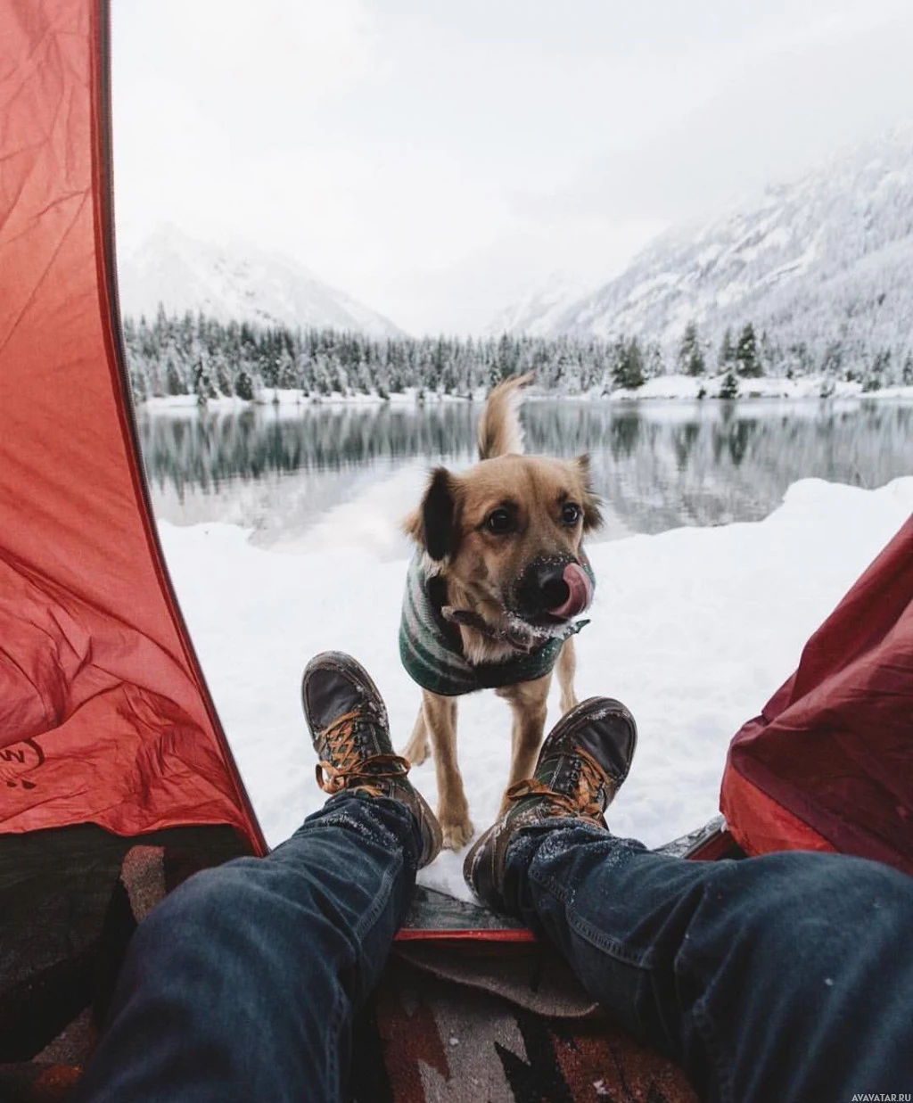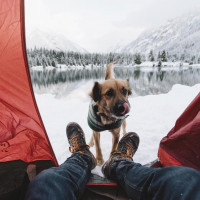 snowy ground near a red tent. There is a person with their feet inside the tent, suggesting they are sitting or lying down in the tent. The setting appears to be a winter camping scenario, possibly during a hike or