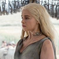 The image shows a character from the television series "Game of Thrones," depicting Daenerys Targaryen portrayed by actress Emilia Clarke. She is in a scene where her expression is one of concern or contemplation, with her hair flowing and a thoughtful gaze towards something off-camera. This character is known for her role as the "Mother of Dragons" throughout the series.