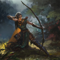 a female character, who appears to be an elf or fantasy archer. She is shown holding a bow and aiming it, with her gaze focused on something out of frame. Her attire suggests she might be in