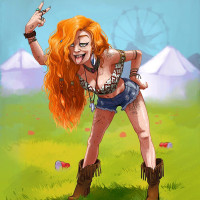 sort of emotion, possibly excitement or defiance. The background shows a carnival atmosphere with tents and a ferris wheel, which contrasts with her