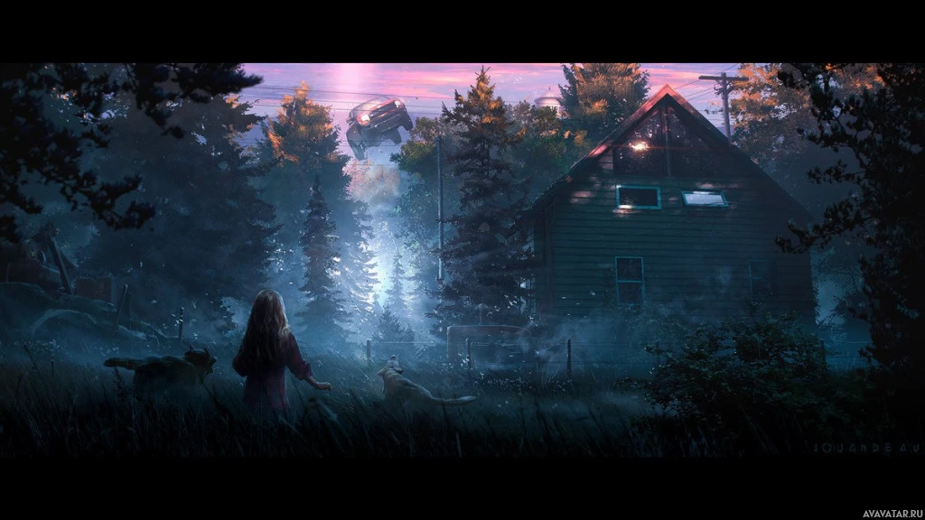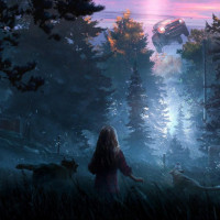 a science fiction story or movie, featuring an idyllic setting that contrasts with the eerie atmosphere suggested by the lighting and the overall mood of the picture. There is no dog or children visible in this image. The background shows a forest with