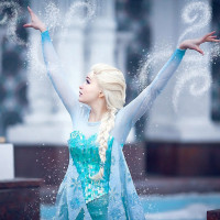 The image depicts a person dressed as Elsa, a character from