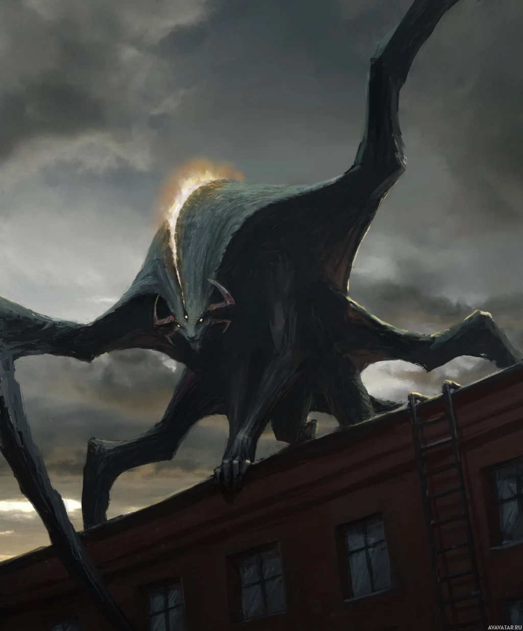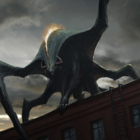 an intense expression as it rises from the ground towards a sky filled with dark clouds. There's also a glimpse of a structure in the background, which appears to be part of
