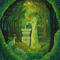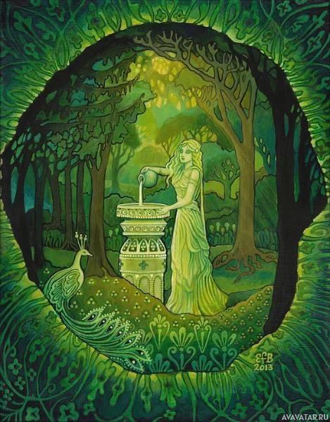 flowing dress, is seated under a tree or shrubbery that forms a canopy over her. She appears to be pouring water from a pitcher into a basin below. Surrounding the central figure are