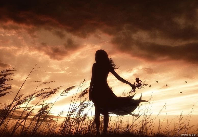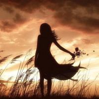 На картинке изображен силуэт девушки, стоящей посреди высоких трав, на том, что кажется либо восходом солнца, либо закатом, учитывая теплые оттенки в небе. Она держит белый предмет, который может быть цветком или источником света. Общая атмосфера картины предполагает спокойную и мирную обстановку, с акцентом на природную красоту сцены.