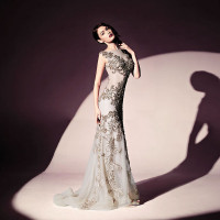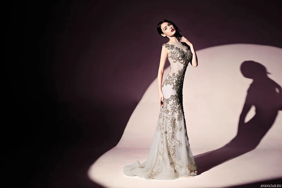 a strapless dress that has intricate detailing on it. The dress seems to have an elegant design and might suggest that she could be at a formal event or attending