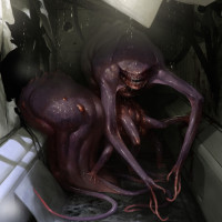 purple creatures with octopus-like tentacles. They are situated inside what appears to be a crumbling