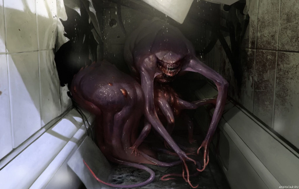 an apocalyptic feel, with water damage on the walls and broken fixtures. The monsters have menacing expressions and their presence in such a mundane location creates