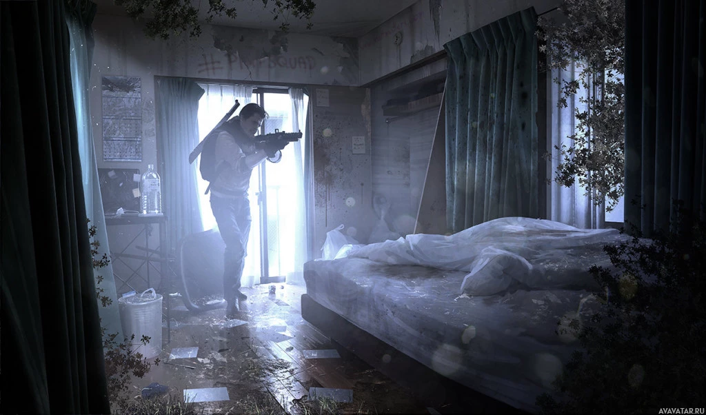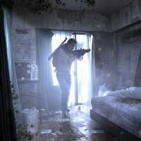 a character in the foreground who is holding a weapon, which is often associated with first-person shooter games. This character seems to be standing at a doorway, and there are signs of environmental damage or destruction around them, such as
