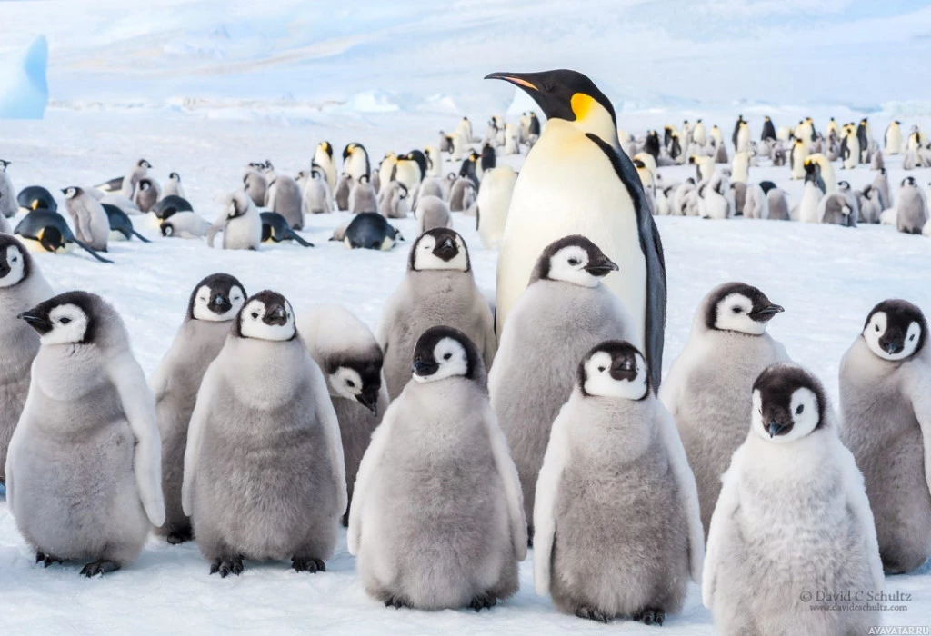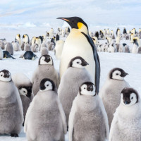 the young ones, and they appear to be looking towards the camera with expressions that could be interpreted as curious or attentive. This setting suggests that these are Emperor Penguins, which are known for their