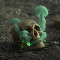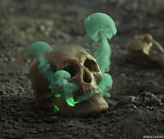 На картинке изображен человеческий череп с зеленым дымом, выходящим из глазниц. Есть и другие фрагменты скелета, видимые вокруг него, предполагая, что это может быть частью художественной или символической экспозиции.