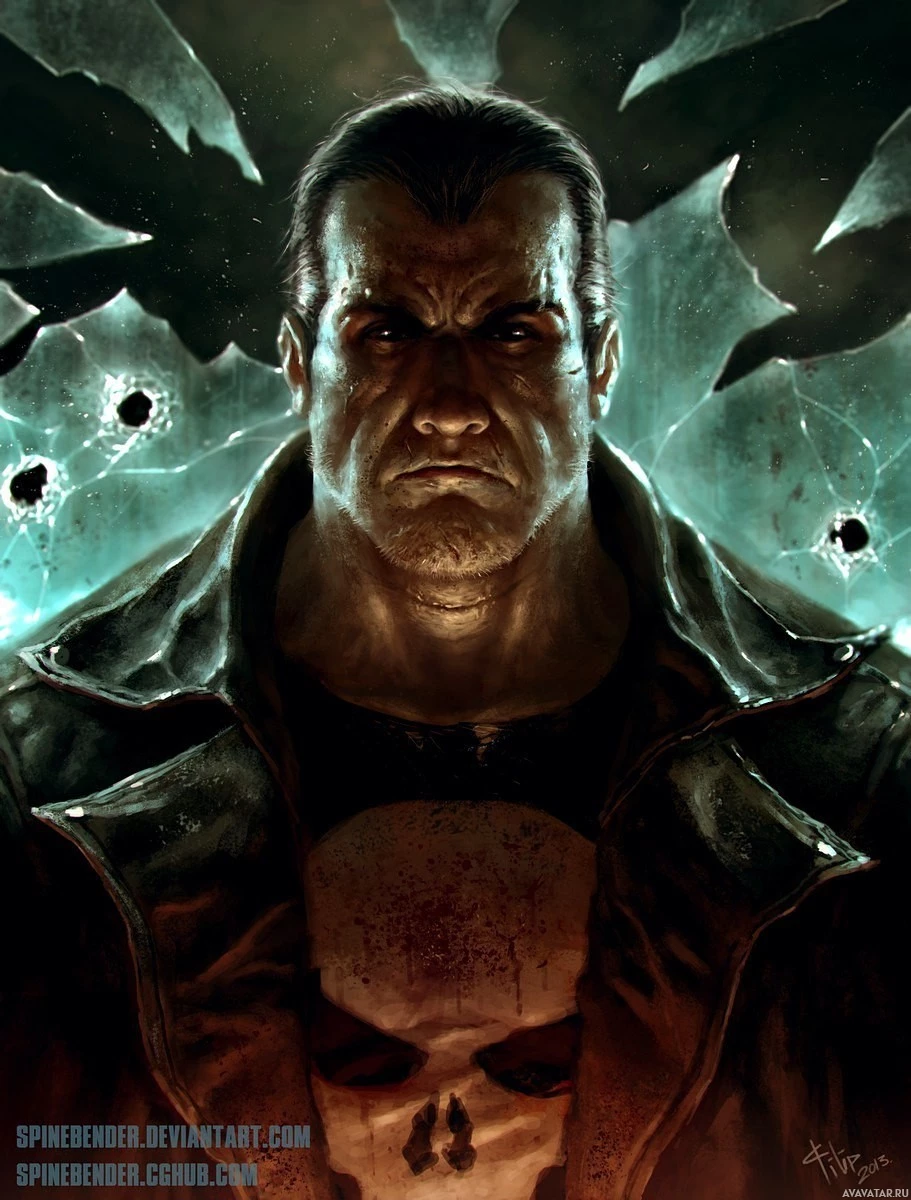 The image features an illustration of a character that resembles the Punisher, known for his role in various comic