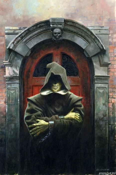 Star Wars" franchise. He is standing in front of an ornate door, wearing his traditional black robes and hood, with his arms crossed, embodying