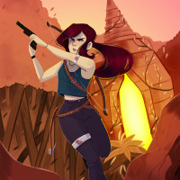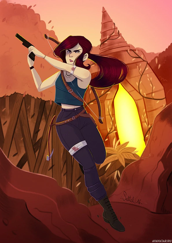 female character who appears to be in a jungle setting. She is holding what seems to be a bow and arrow, suggesting that she might be engaging in some form of hunting or exploration. Her attire includes a tank top and pants, which could indicate a casual adventure rather than a formal outfit typically associated with the Lara Croft character from