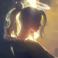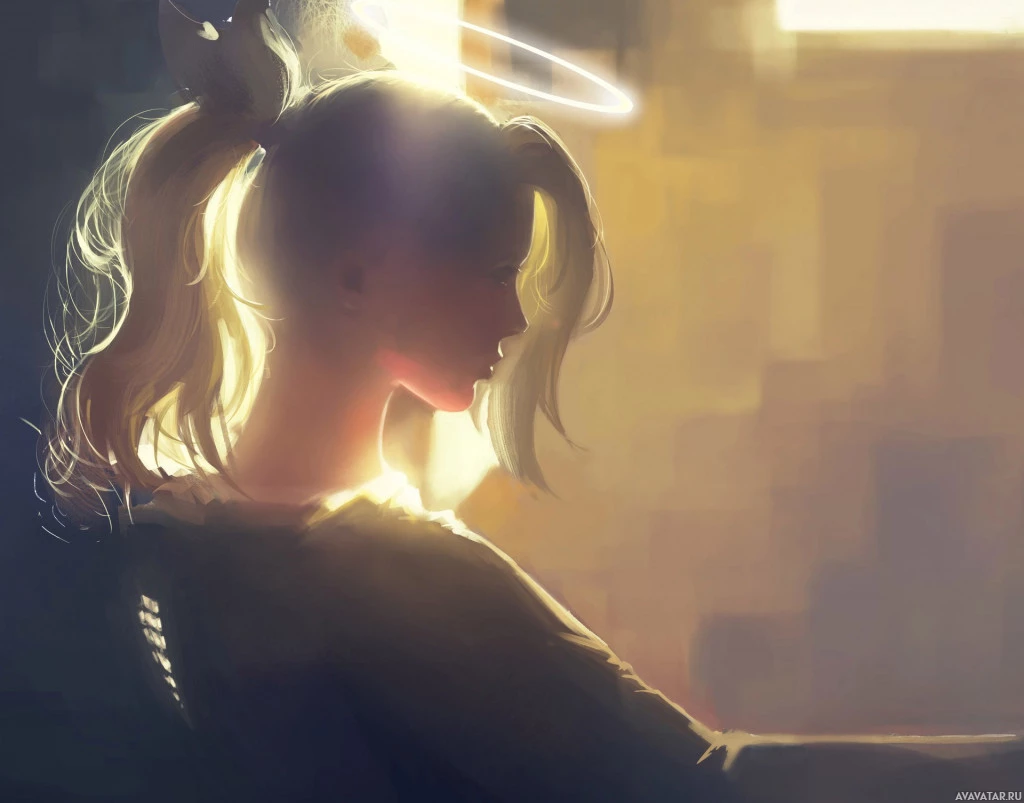 На картинке изображена стилизованная иллюстрация девушки со светлыми волосами, стилизованная в косички. Ее голова слегка наклонена в одну сторону и смотрит в сторону, создавая впечатление созерцания или мечтания. В произведении используется мягкое освещение и теплые цвета, которые предполагают, что оно может быть вечерним или внутренним.
