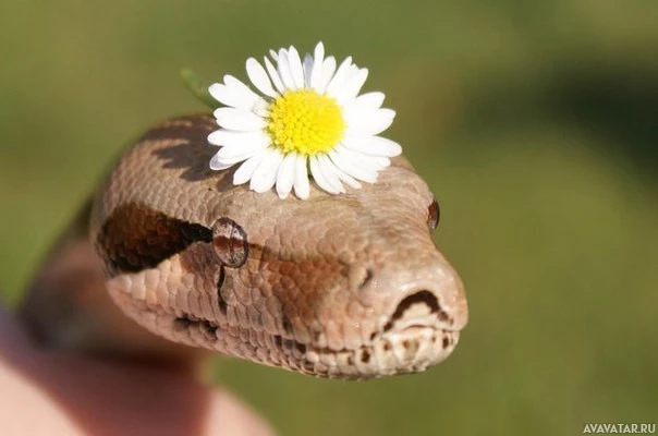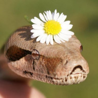 The image shows a snake with a daisy on its head. This is likely done for a photograph, possibly as an artistic or whimsical gesture. The snake appears to be