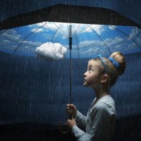 early morning or evening. It appears to be raining, and the child seems to be looking up at the sky with a pensive or contemplative expression. The umbrella has