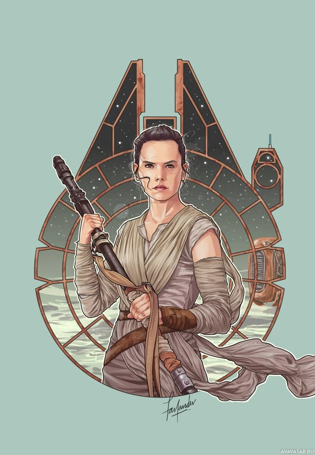 a blaster rifle and wearing her iconic white jacket, which is part of her attire as a member of the Resistance. The background includes a Death