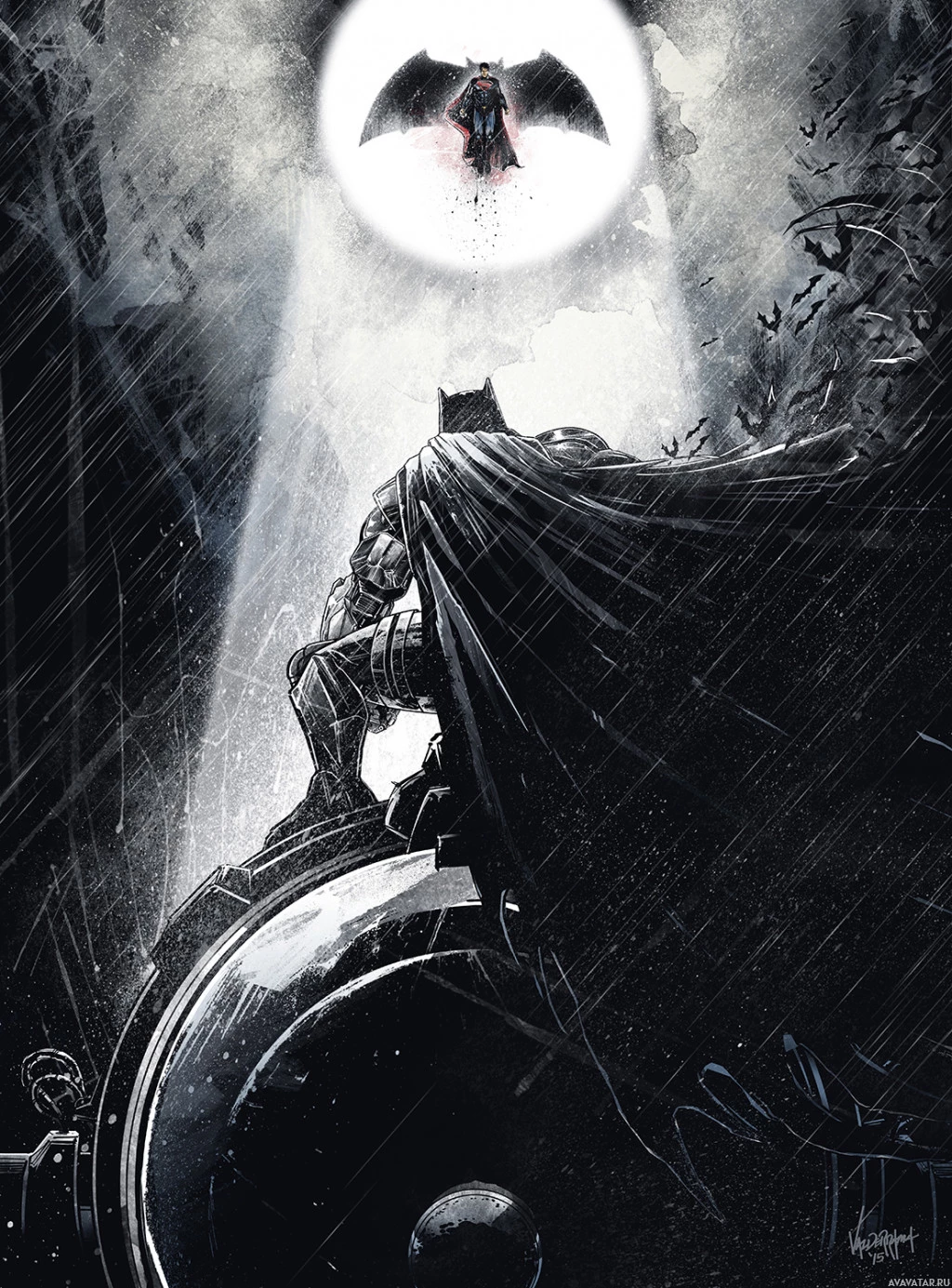 superhero characters: Batman and Superman. Batman, the character on the left side of the frame, is seen from behind while he is sitting in what appears to be his classic bat-