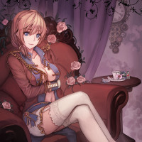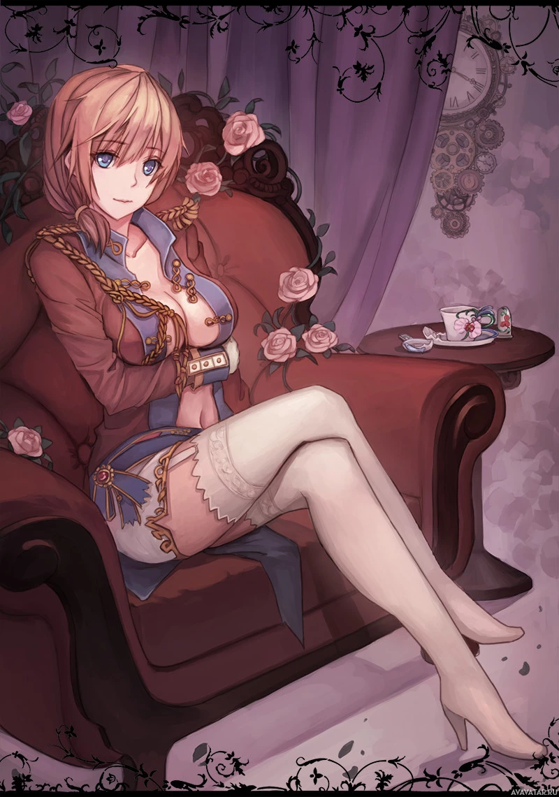 a young woman with blonde hair. She is wearing a red and blue outfit that includes stockings and boots, giving her a fantasy-style appearance. She is seated on a couch adorned with roses and
