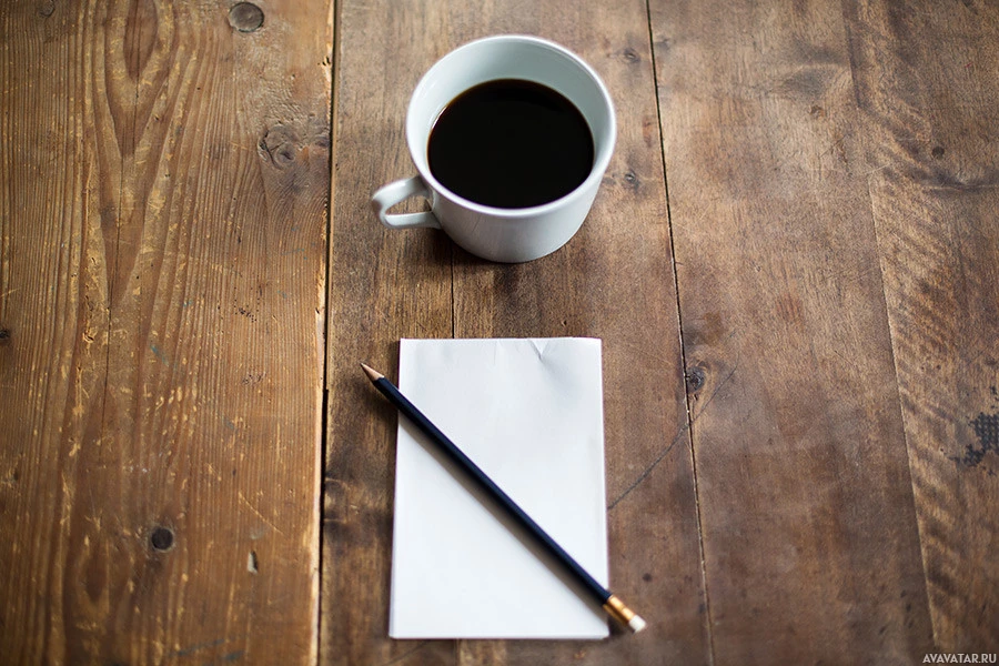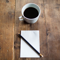 a wooden surface. There is a white mug filled with what appears to be coffee or tea, and next to it is an empty