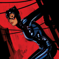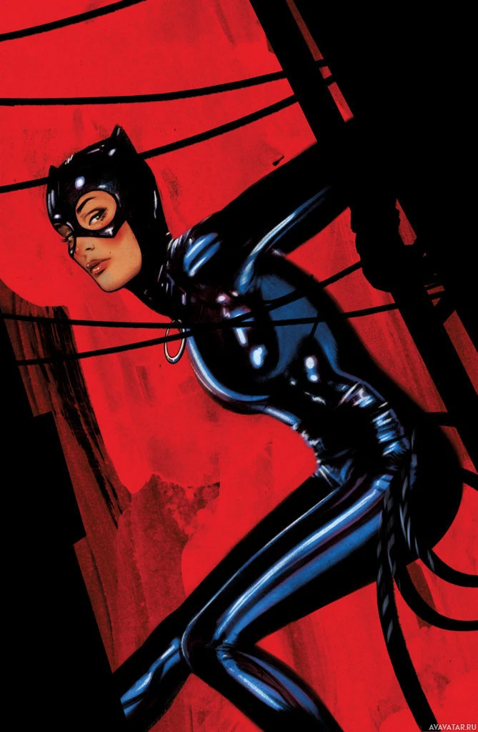 The image features an illustration of a character known as Catwoman. She is depicted in her