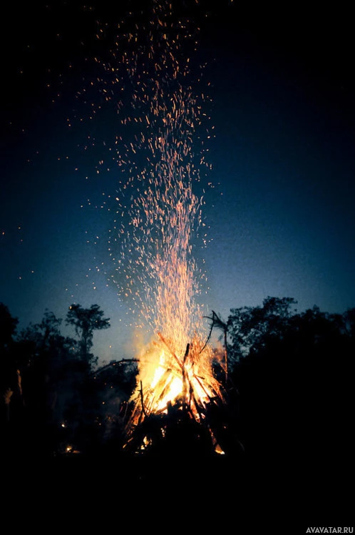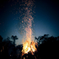 a nighttime scene with a group of people gathered around a large bonfire. They appear to be enjoying the warmth and light from the fire, which is visible in the center of the image. There are also sparks flying up into the air above the fire, indicating that it's actively burning. The surroundings suggest