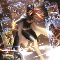 an illustrated scene featuring a character dressed as Batgirl. She is surrounded by digital elements such as holograms and screens displaying her name "Batgirl" in