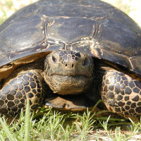 The image shows a large tortoise, which is a type of reptile. It has a hard shell with patterned segments and is walking on what appears to be dry grass or dirt. This tortoise seems to be in a natural environment, possibly a desert or grassland habitat.