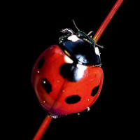 На картинке изображена красная божья коровка с черными пятнами на крыльях и теле, что характерно для божьих коровок. Он расположен таким образом, что кажется, что он «падает» или подвешен в воздухе на темном фоне, создавая ощущение движения или игривости.