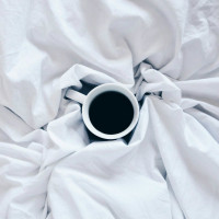 a warm drink like coffee while snuggled up under blankets. The focus is on