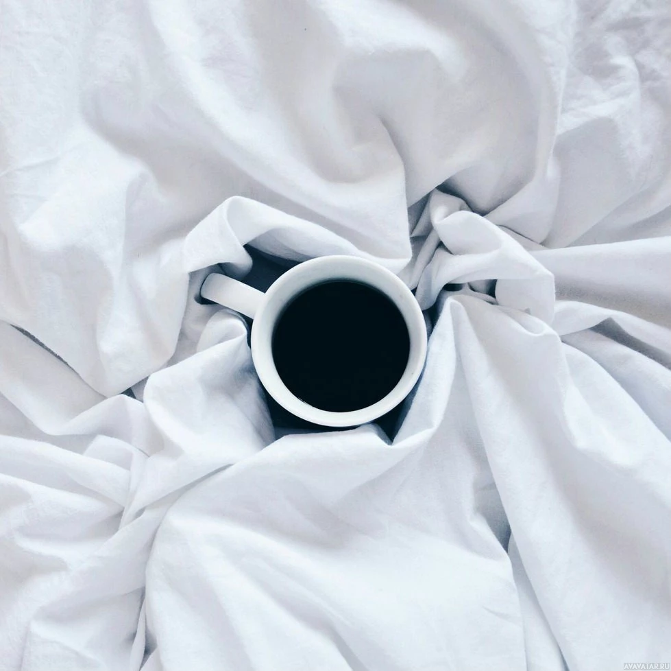 a cup of coffee placed on top of crumpled white sheets, with the sheets appearing to be in motion as if they are being blown by the wind. This suggests a cozy or relaxing atmosphere often associated with enjoying